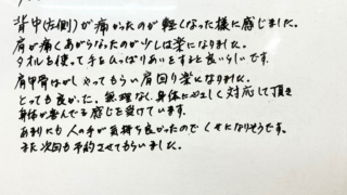 【お客様の声】鹿児島市で背中の痛み・上がらない肩を改善!「身体に優しい」施術でくせになりそう