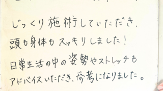 【お客様の声】鹿児島市で心身スッキリ!じっくり全身ケアと日常生活での姿勢・ストレッチアドバイスまで