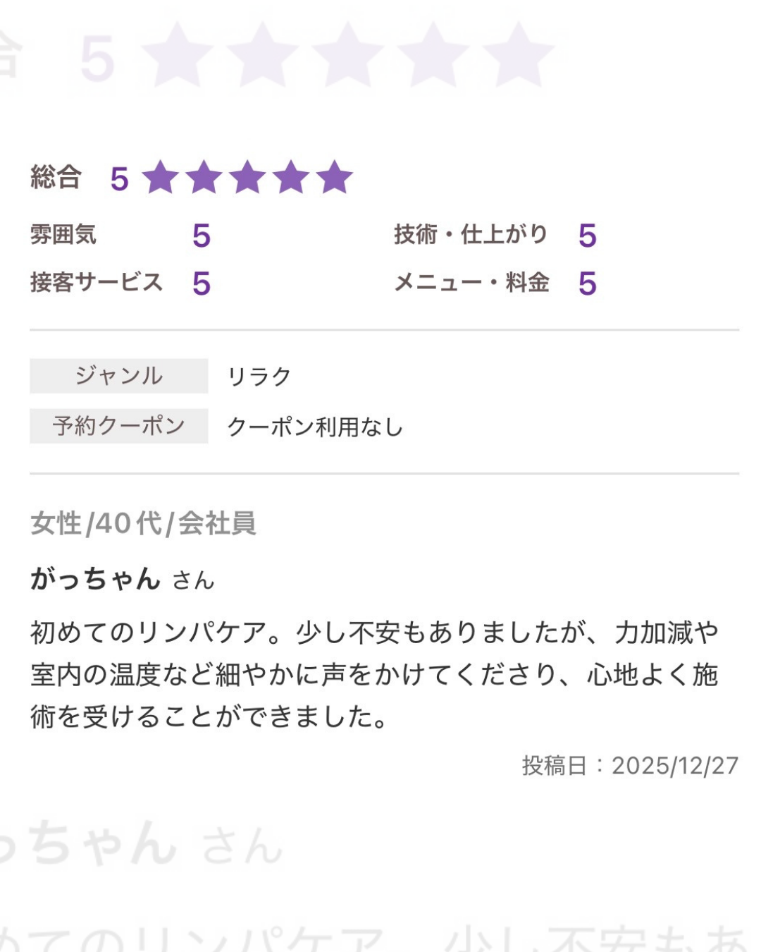本日は、初めてのリンパケアを体験され、リラックスした時間をお過ごしいただいたお客様からの感想をご紹介いたします。