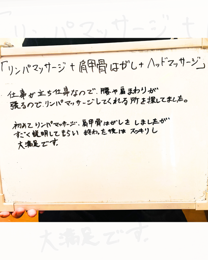 本日は、立ち仕事によるお体の張りを解消するために、初めてリンパケアを体験されたお客様の感想をご紹介いたします。