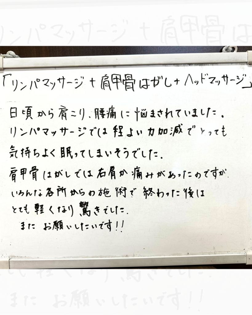 肩甲骨はがしでは、右肩の痛みがあったのですが、いろんな各所からの施術で終わった後は、とても軽くなり驚きでした。