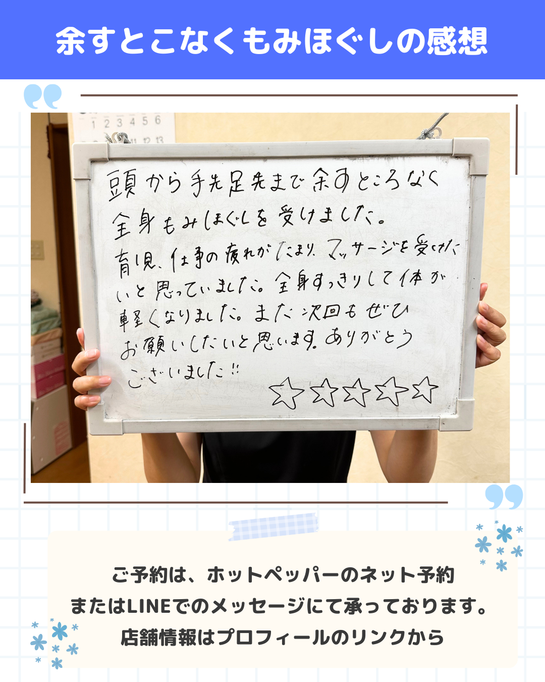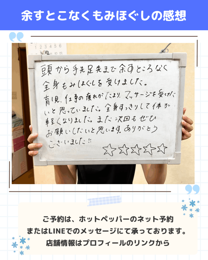 今回は、当店で全身もみほぐしを体験してくださったお客様から、とても嬉しいご感想をいただきましたのでご紹介します!