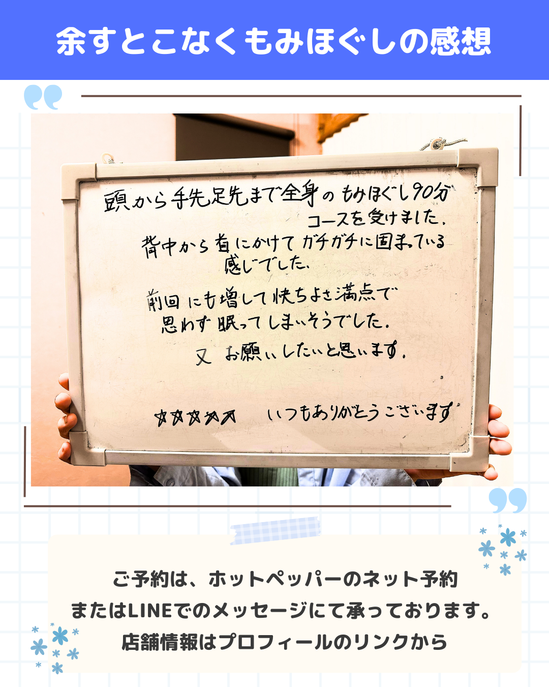しっかりした圧でほぐしてもらえて、とてもスッキリしました。特に下肢は気持ち良かったです。