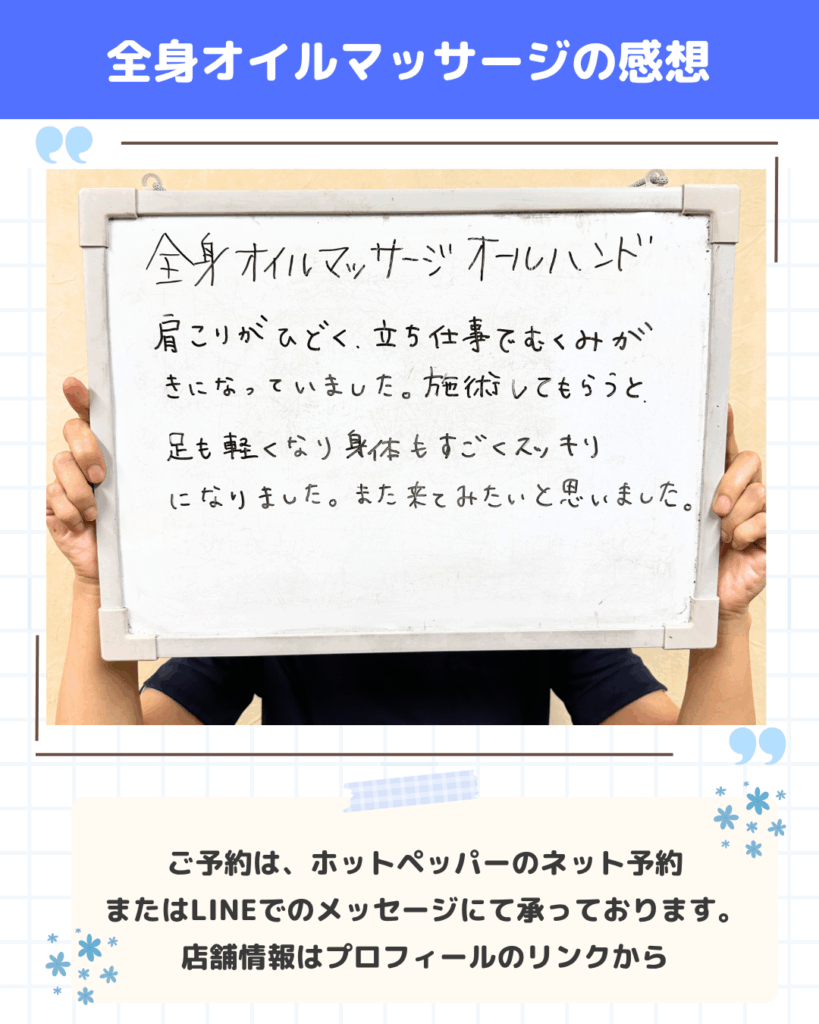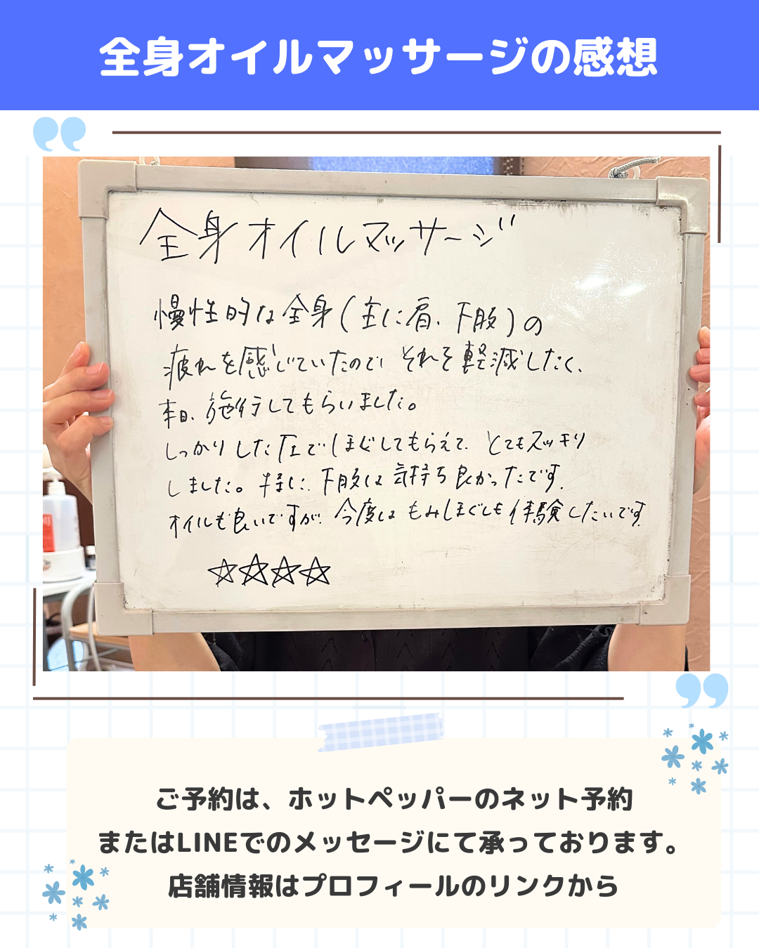 オイルも良いですが、今度はもみほぐしも体験したいです。