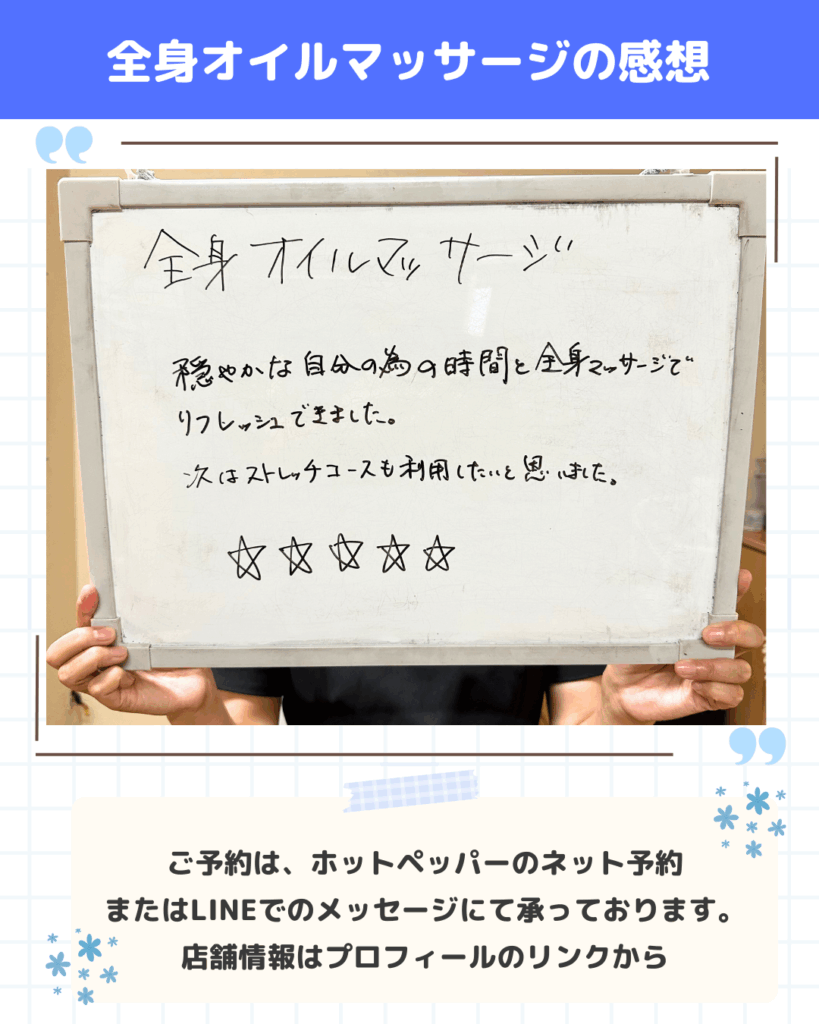 全身オイルマッサージで、ただ揉みほぐすだけでなく、。「穏やかな自分の為の時間」を過ごしていただけたこと、大変嬉しく思います。