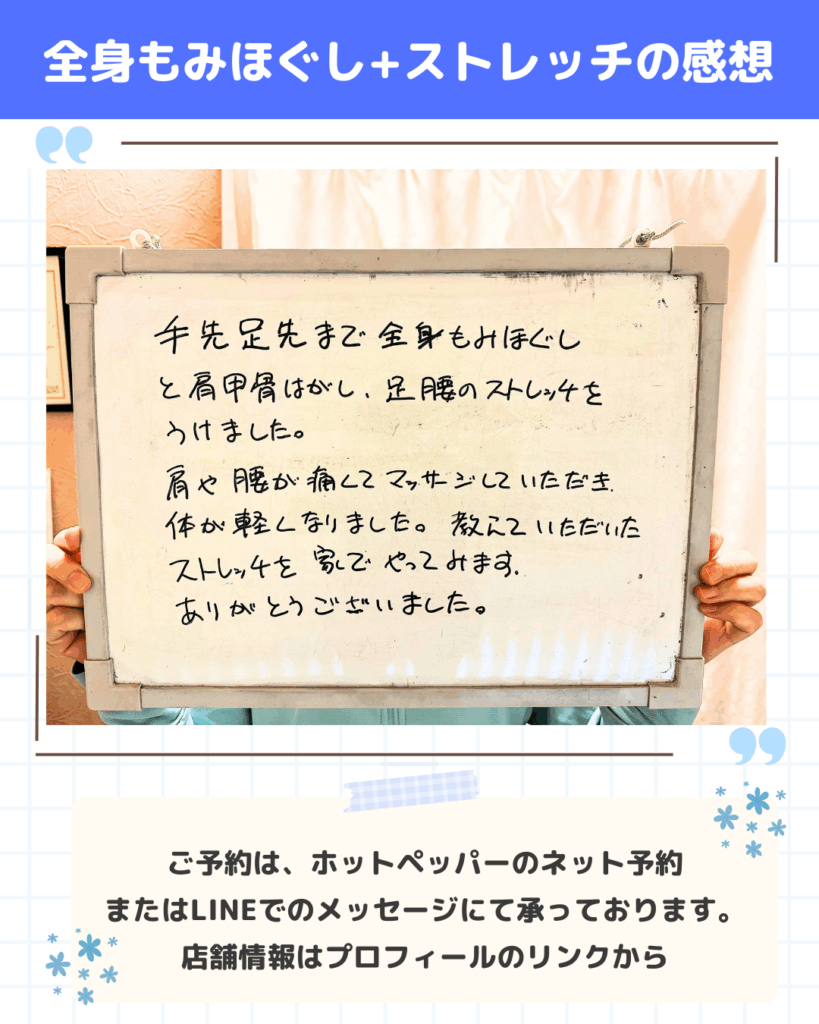 今回は、当店の施術を受けてくださったお客様からいただいた、大変嬉しいご感想をご紹介します。お仕事でのお疲れが溜まっていたようですが、施術で身体が軽くなったと喜んでいただけました!