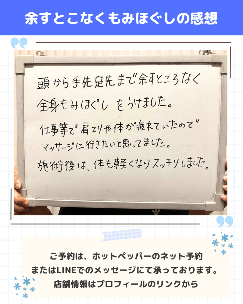 先日、90分間の全身もみほぐしコースを受けてくださったお客様から、嬉しい感想をいただきました。