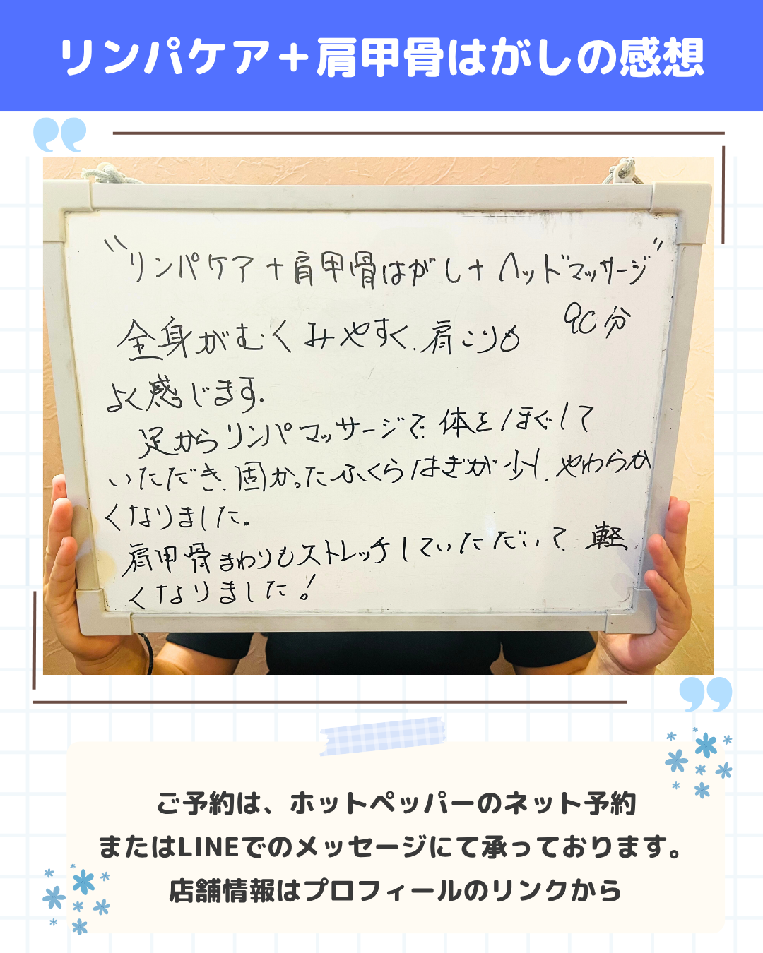 今回は、当店で「リンパケア+肩甲骨はがし+ヘッドマッサージ 90分」コースを体験されたお客様から、大変嬉しいご感想をいただきましたのでご紹介します!