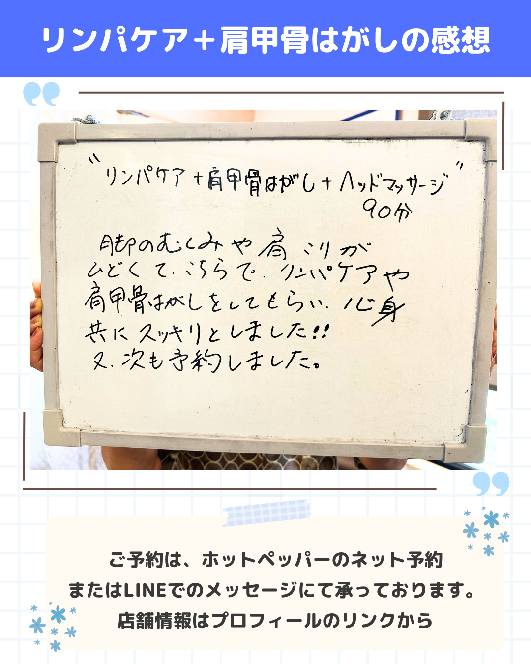 今回は、当店の人気メニュー**「リンパケア+肩甲骨はがし+ヘッドマッサージ90分」**をご体験いただいたお客様からいただいた、大変嬉しいご感想をご紹介いたします。
