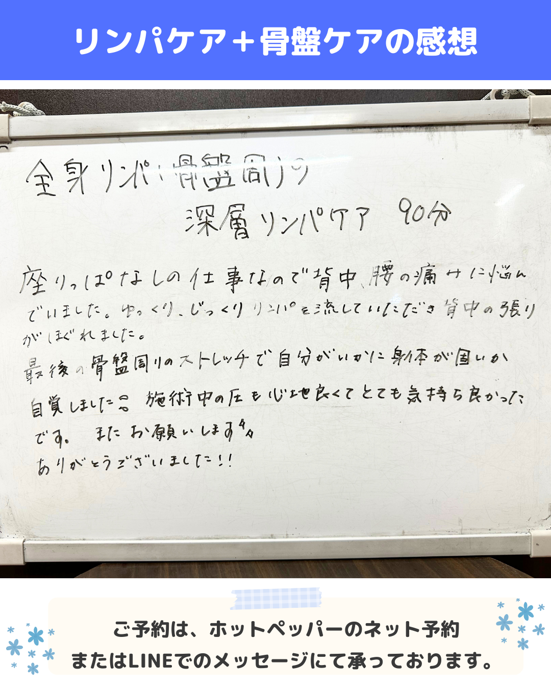 ゆっくり、じっくりリンパを流していただき、背中の張りがほぐれました。