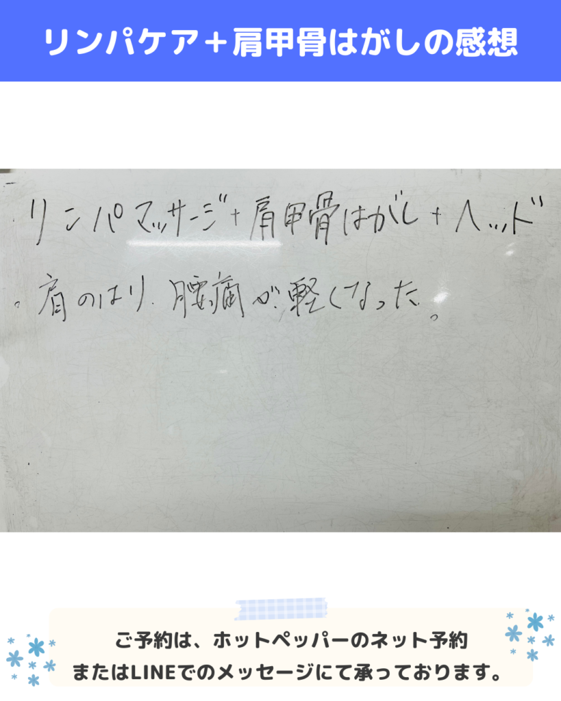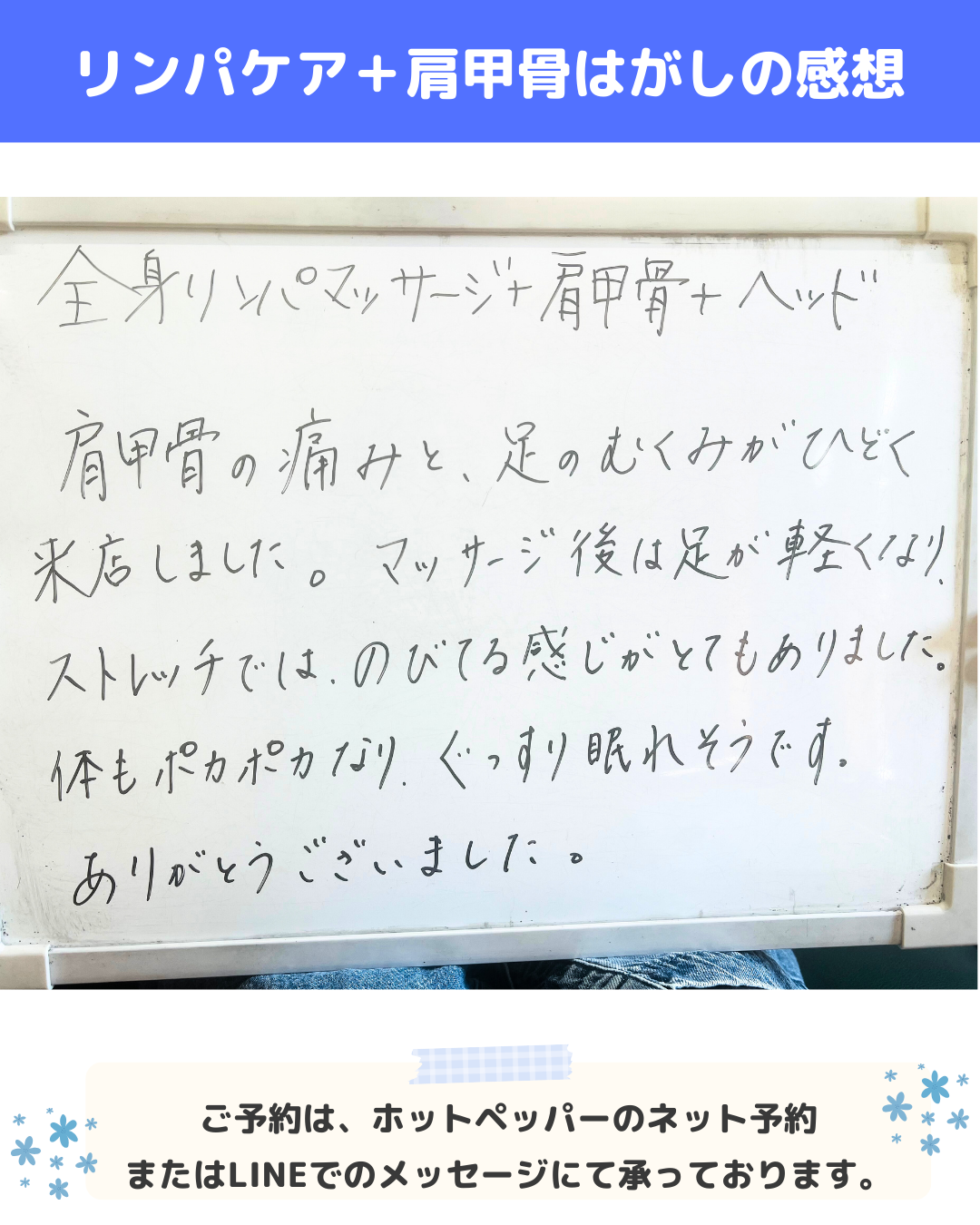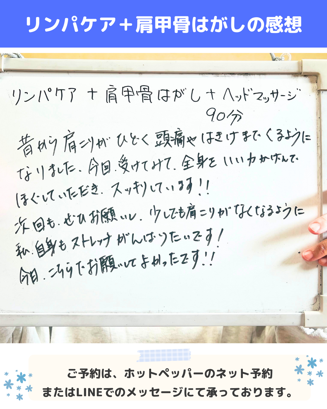 リンパマッサージ+肩甲骨はがし+ヘッドスパをうけました。