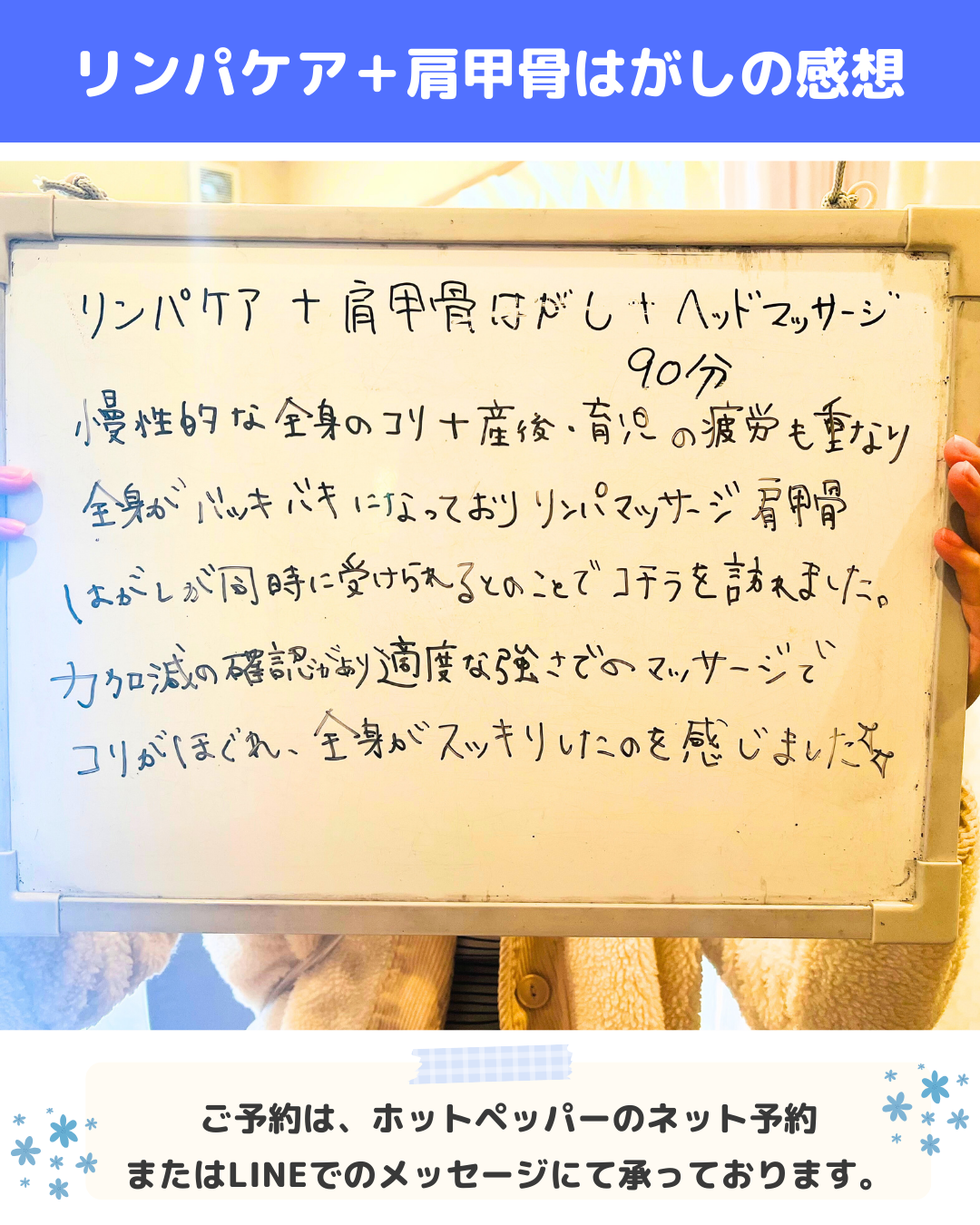 慢性的な全身のコリに加え、産後・育児による疲労が重なり、つらい状態でお越しのお客様。リンパマッサージと肩甲骨はがしが同時に受けられる点に魅力を感じ、当店の人気コースをご体験いただきました。
