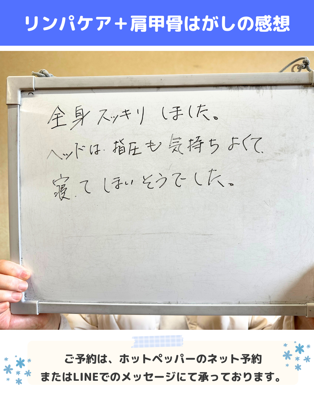 当店の「リンパケア+肩甲骨はがし+ヘッドマッサージ90分」をご体験いただいたお客様。全身のケアに加え、特にヘッドマッサージにご満足いただけました。
