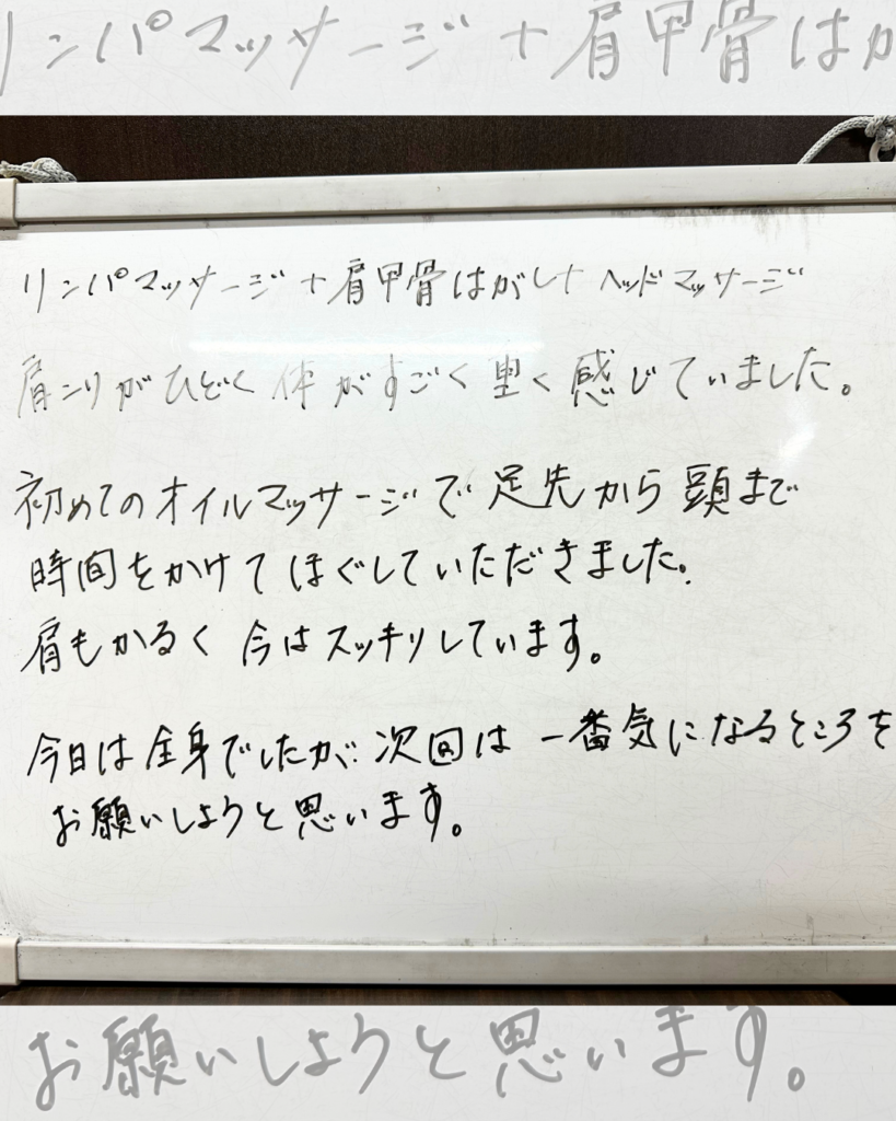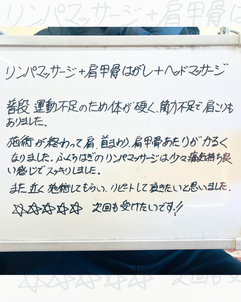 施術が終わって、首、肩まわり、肩甲骨あたりがかるくなりました。ふくらはぎのリンパマッサージは少々イタ気持ち良い感じでスッキリしました。
