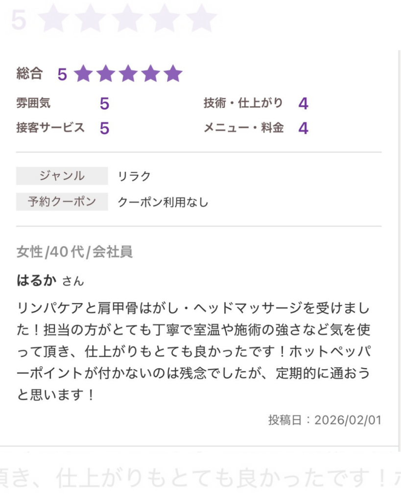 また近く、施術をしてもらい、リピートしていただきたいと思いました。
