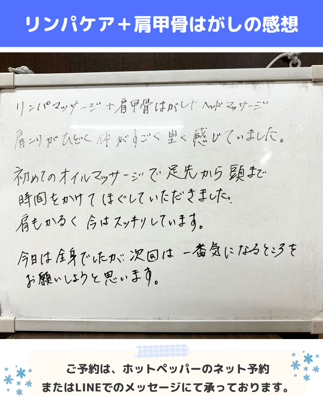 先日、リンパマッサージ+肩甲骨はがし+ヘッドマッサージの複合コースを受けてくださったお客様から、嬉しいお言葉をいただきました。