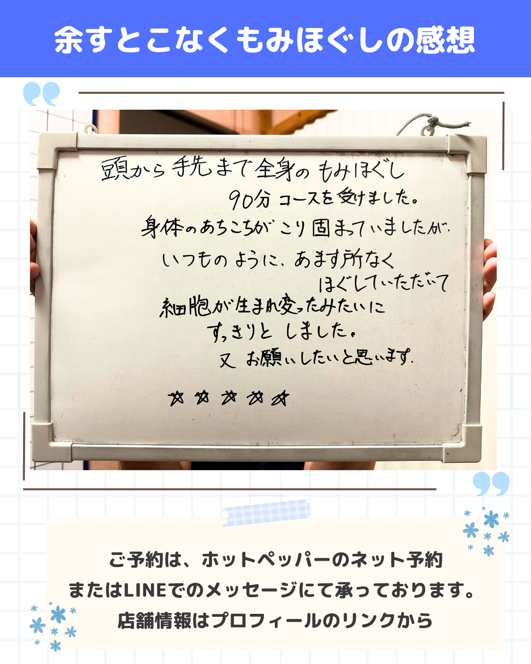掲載しているお時間は施術時間です。ご案内が若干前後する場合がございます。