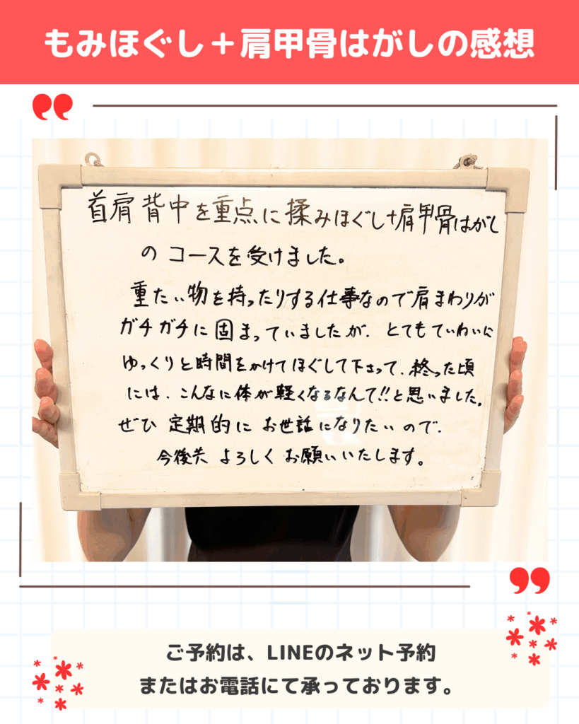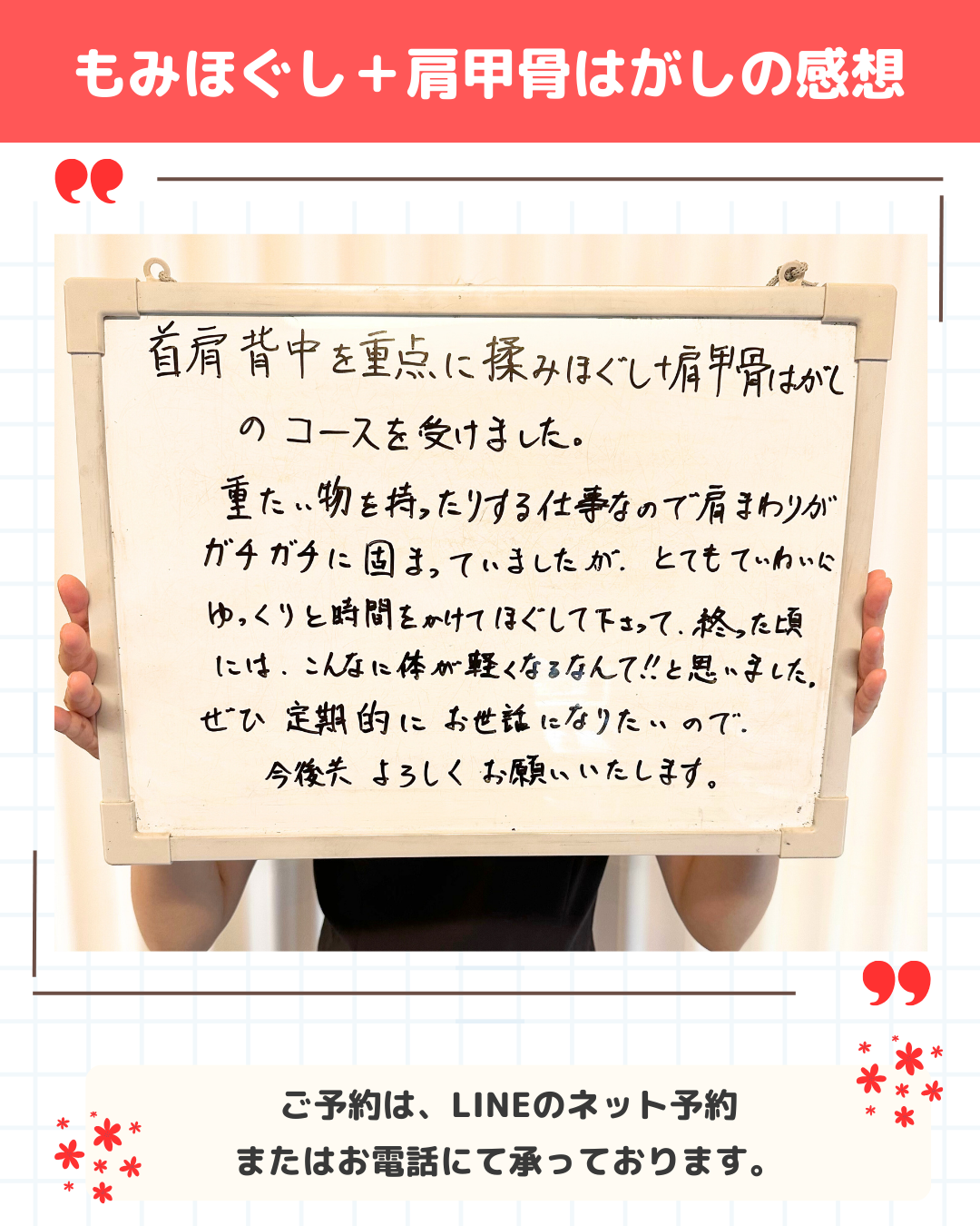 重たい物を持ったりする仕事なので、肩回りがガチガチに固まっていましたが、とてもていねいにゆっくりと時間をかけてほぐして下さって、終わったころには、こんなに体が軽くなるなんて‼!と思いました。是非、定期的にお世話になりたいので、今後ともよろしくお願いいたします。