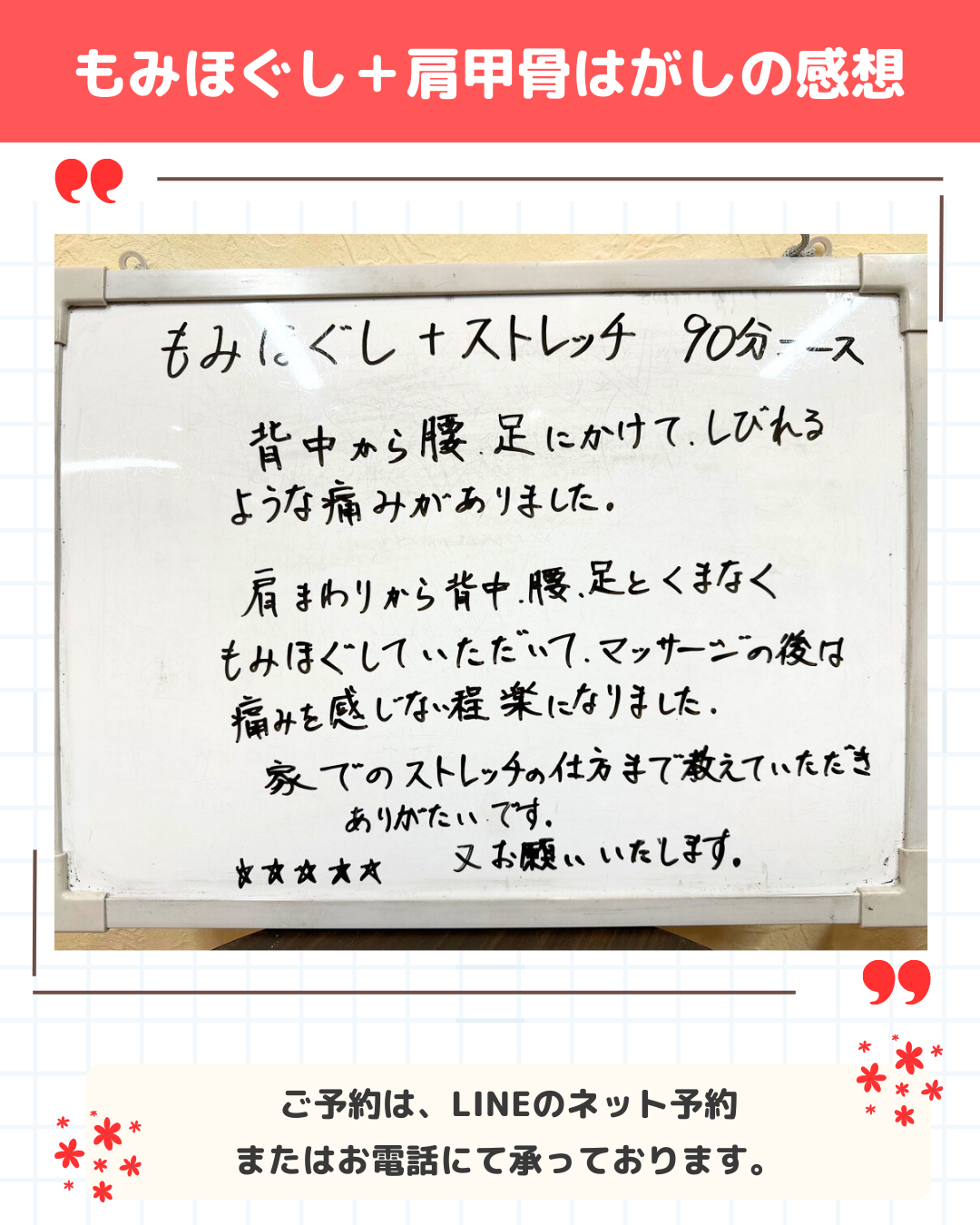 肩まわりから背中、腰、足をくまなくもみほぐしていただいて、マッサージの後は痛みを感じないほど楽になりました。