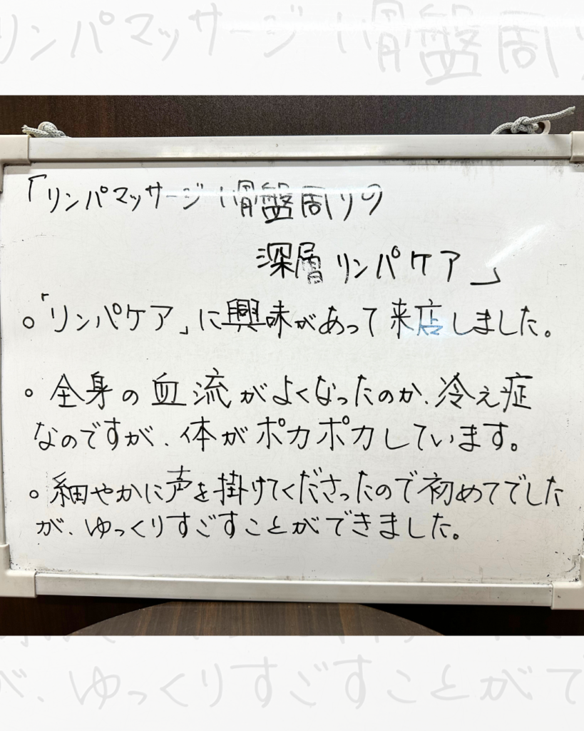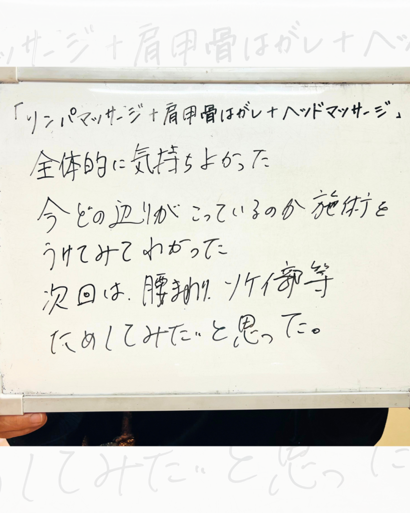 強さの調整のため、施術中に数回強さ確認のお声がけをさせて戴いております。
