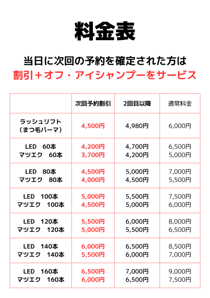 こちらの料金表は、まつ毛パーマ(マツパ・ラッシュリフト)、まつ毛エクステ(マツエク)、LEDエクステ(マツエク)の一覧です。