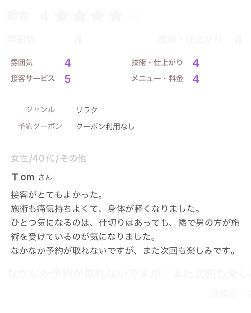 ひとつ気になるのは、仕切りがあっても、隣で男の方が施術を受けているのが気になりました。