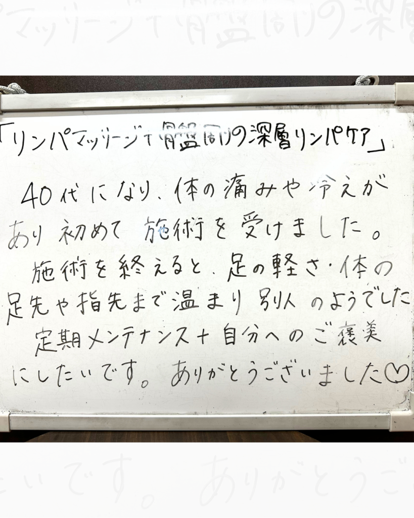 巡りが良くなることで、指先までポカポカと温まる感覚を味わっていただけて良かったです。定期的なケアは、40代からの健やかな体づくりの大きな支えになりますよ。